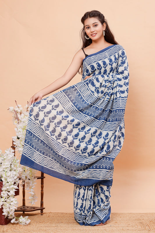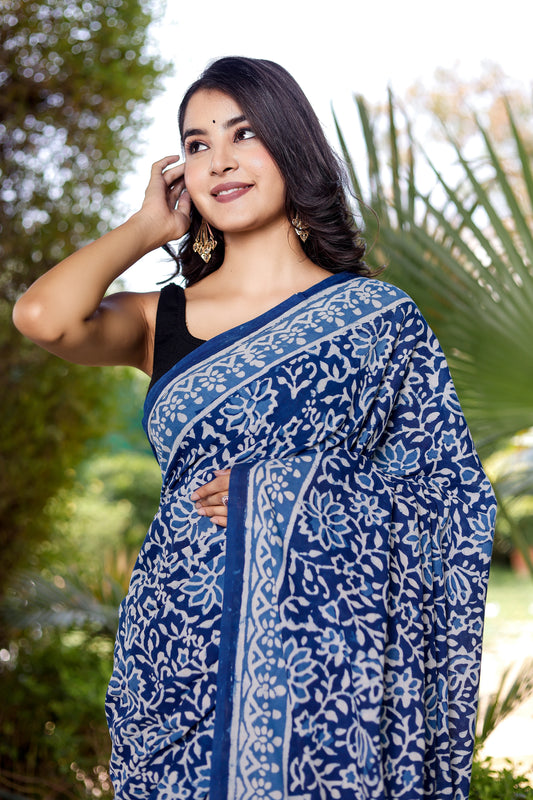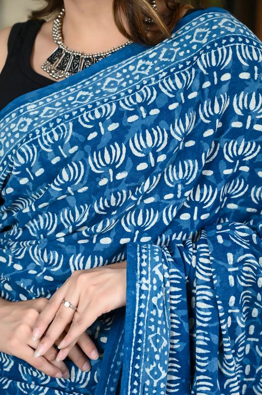 Indigo kairi Hand Block Printed Mul Cotton Saree (Indigo Blue)