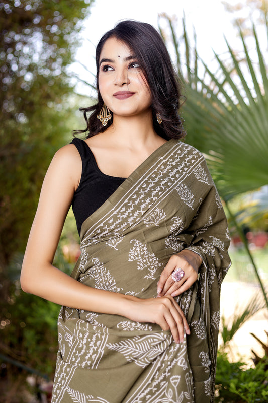 Mehandi Green Hand Printed Pure Mul Cotton Saree