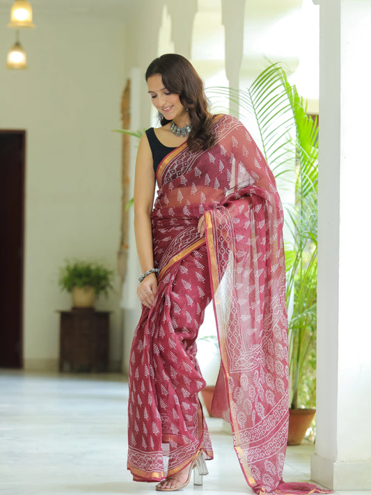 Maroon Bootie Pure Hand Block printed Kota Doria saree