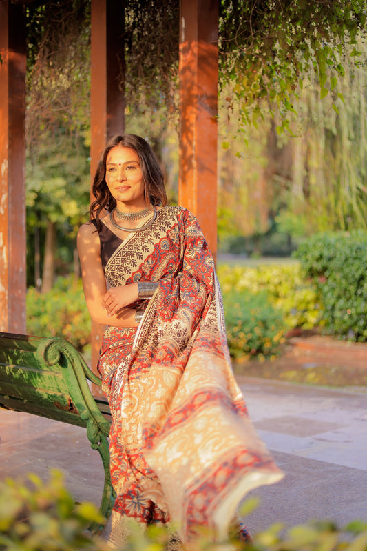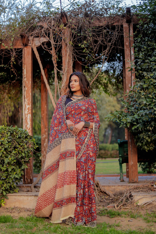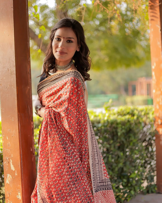 Bagru gadh red jaal Block Print Pure Cotton Saree