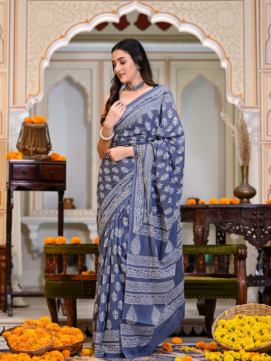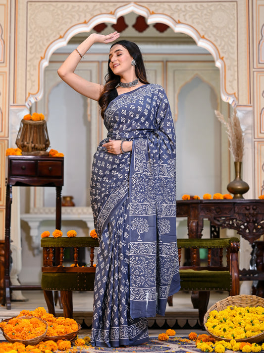 Grey Choti Booti Block Print Pure Cotton Saree