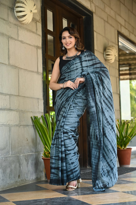 Grey and black color tie die print pure cotton saree