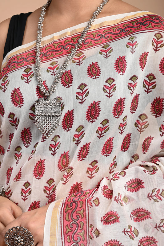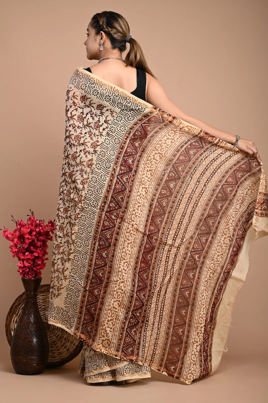 Hand Block Printed Chanderi Silk Saree (Bagru Print)