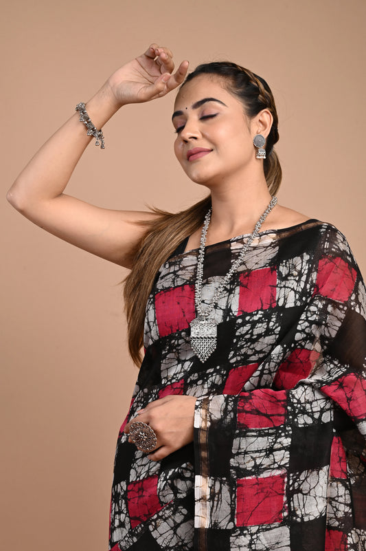 Hand Block Printed Chanderi Silk Saree (Batik Print)