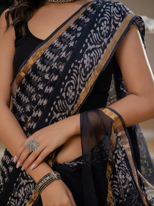 Bagru Black Booti Printed Hand Block Kota Doria Saree