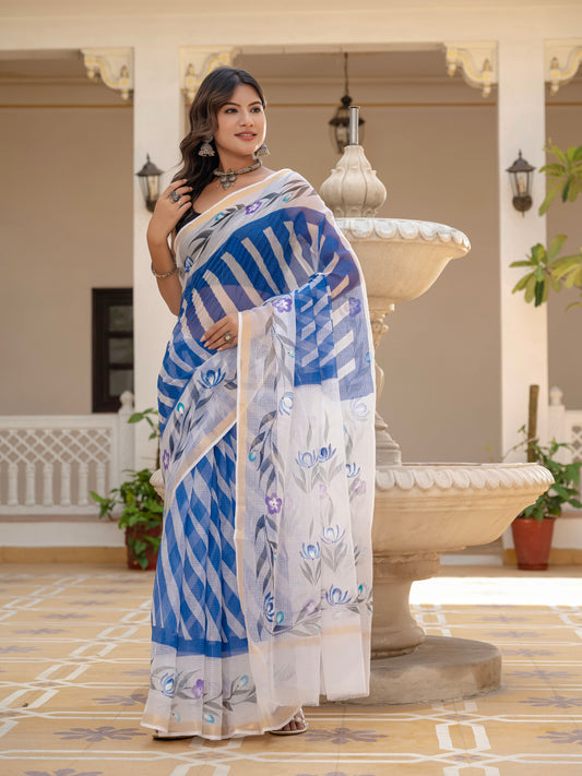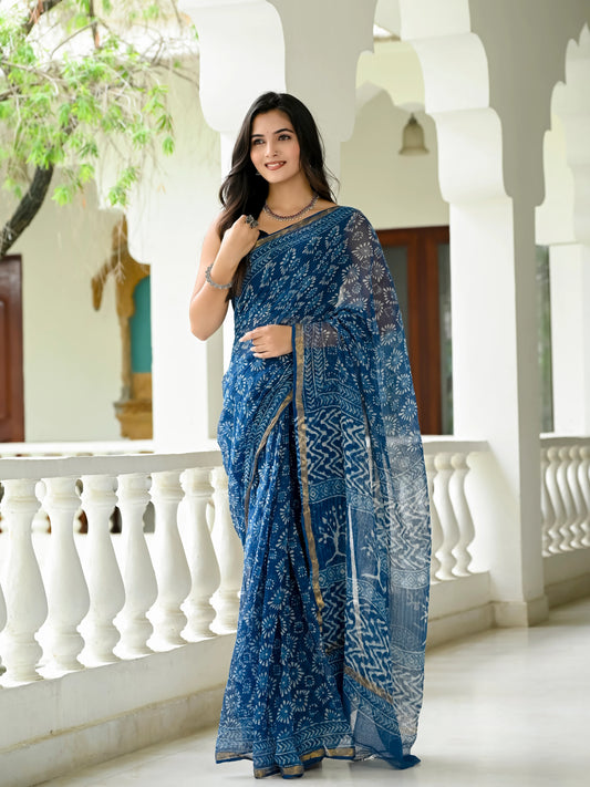 Indigo Bootie Hand Block Printed Pure Kota Doria Saree