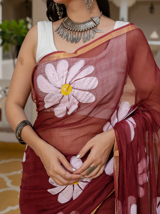 Morpankh Printed Maroon Pure Hand Block printed Kota Doria saree