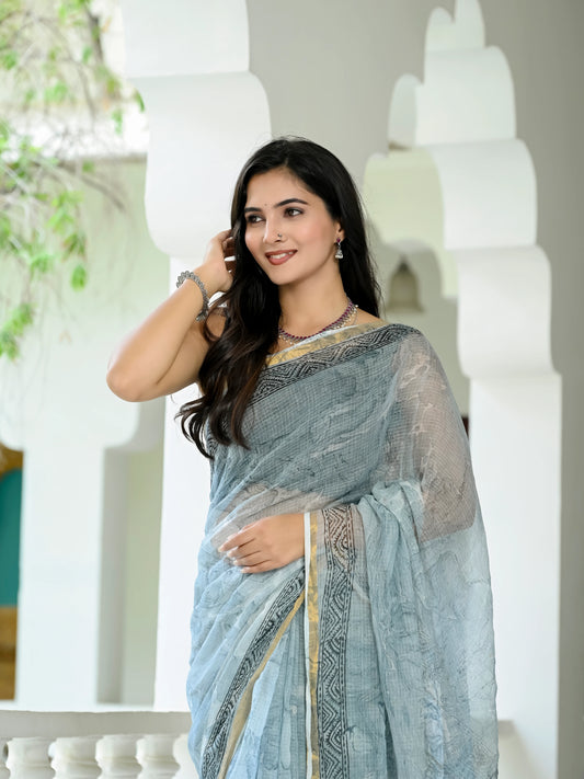 Grey Marble Printed Pure Hand Block printed Kota Doria saree