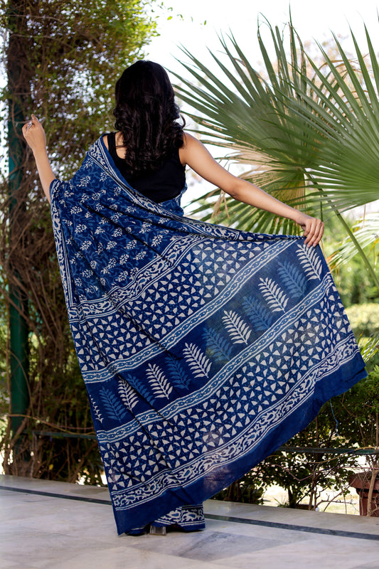 Kamal Booti Indigo daabu Hand Block Print Pure Cotton Saree