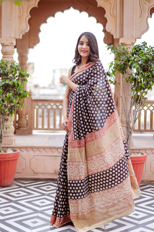 Polka Dot Bagru Bagh Block Print Pure Cotton Saree