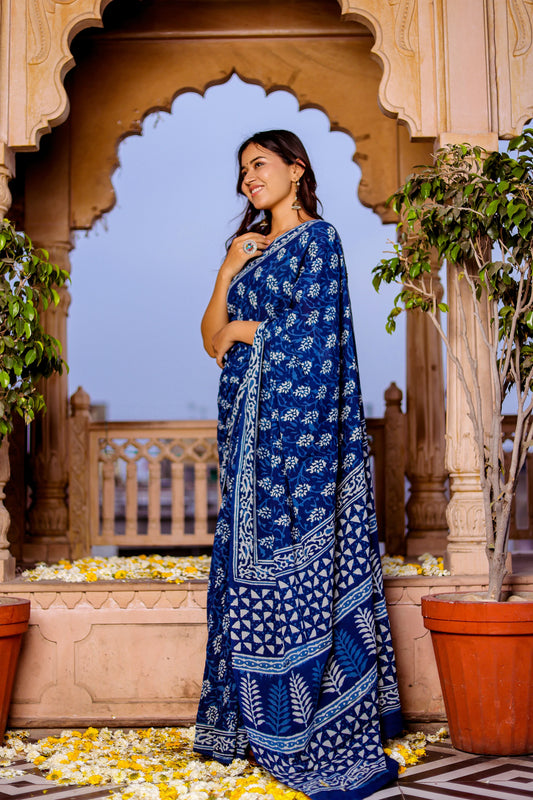Indigo Blue Daabu Salli Block Print Pure Cotton Saree