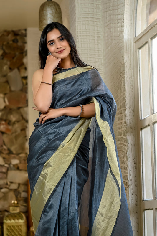 Grey color kota silk saree with heavy zari golden border