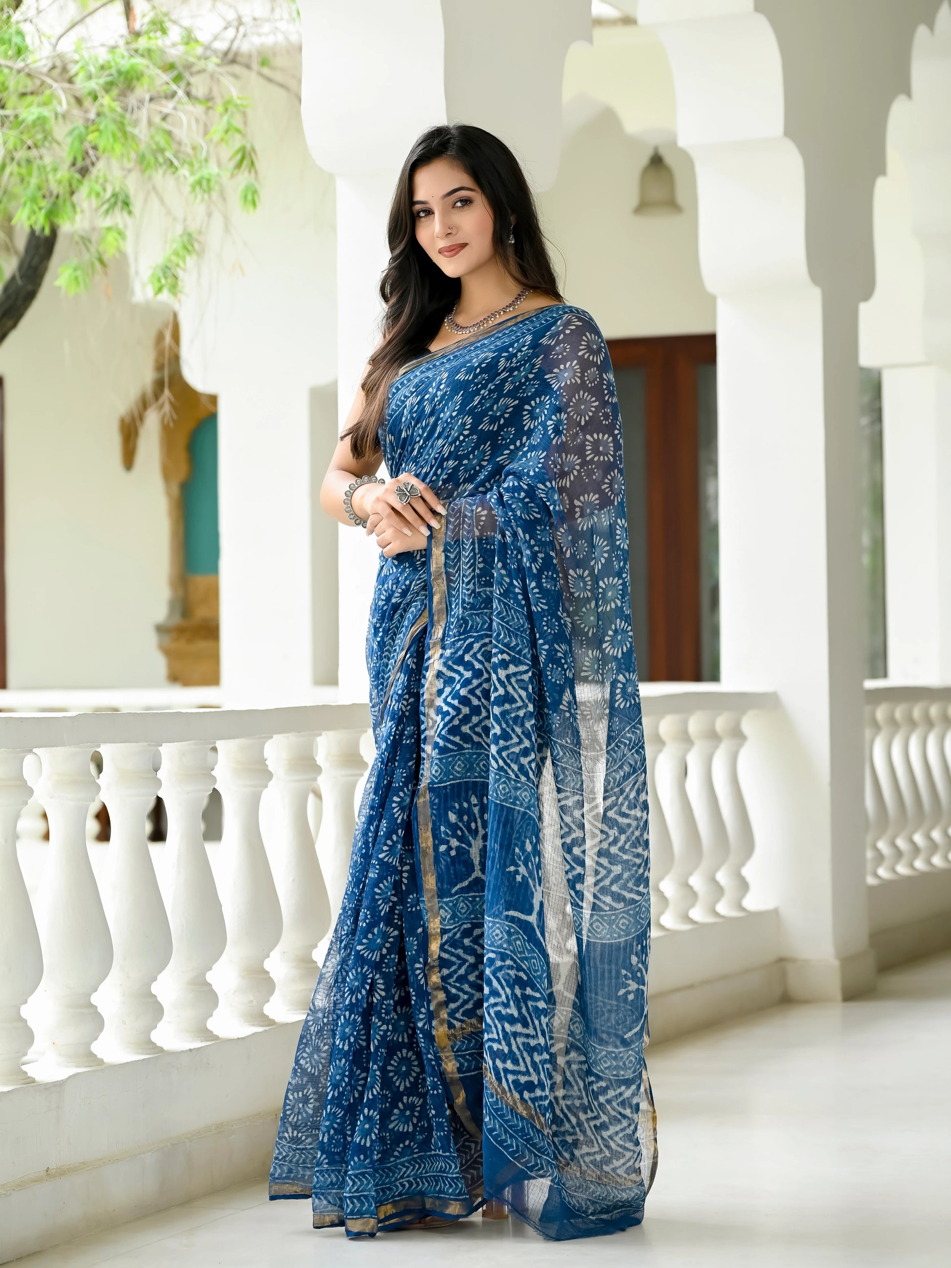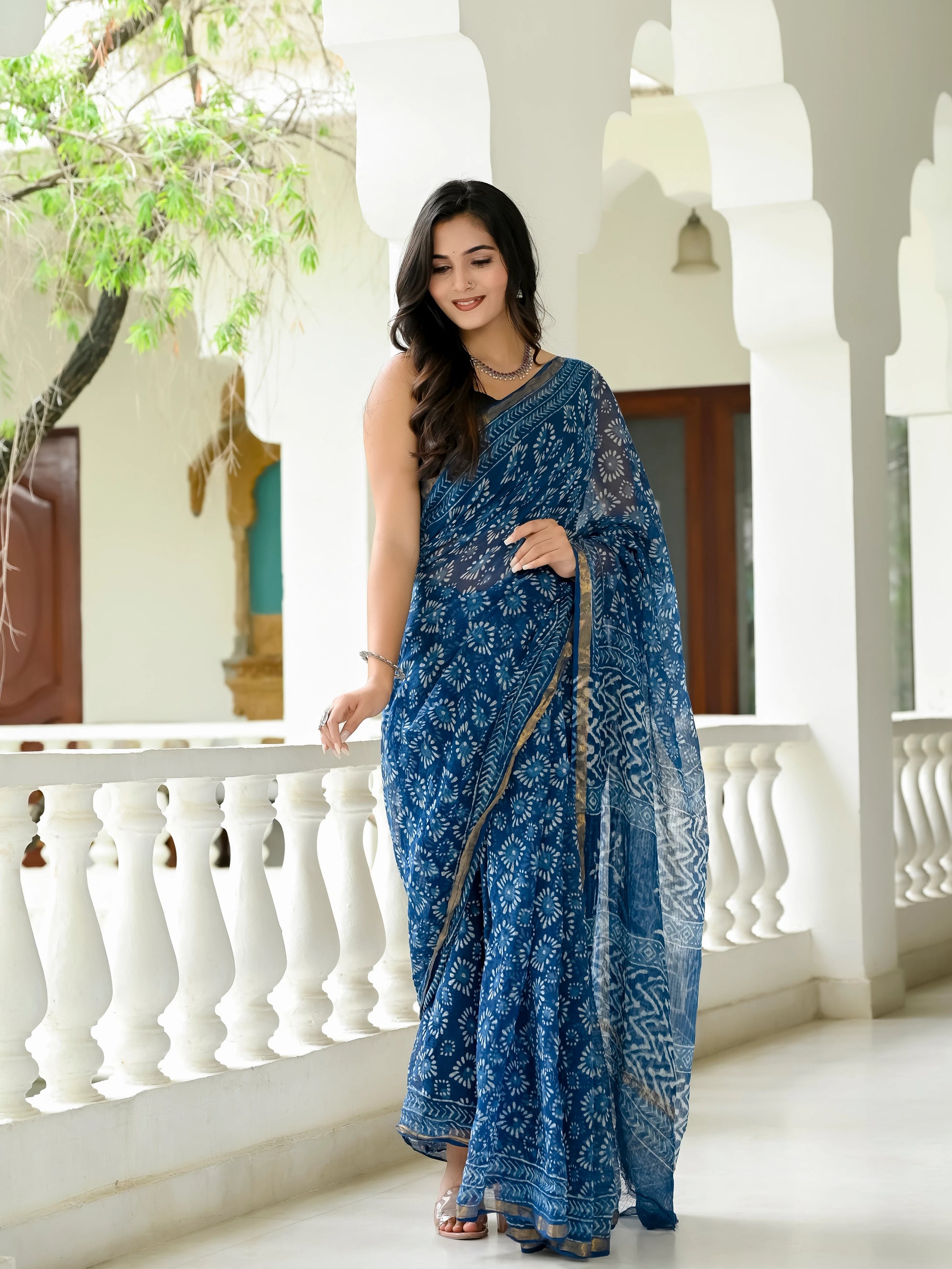 Indigo Geometric Block Printed Pure Kota Doria Saree