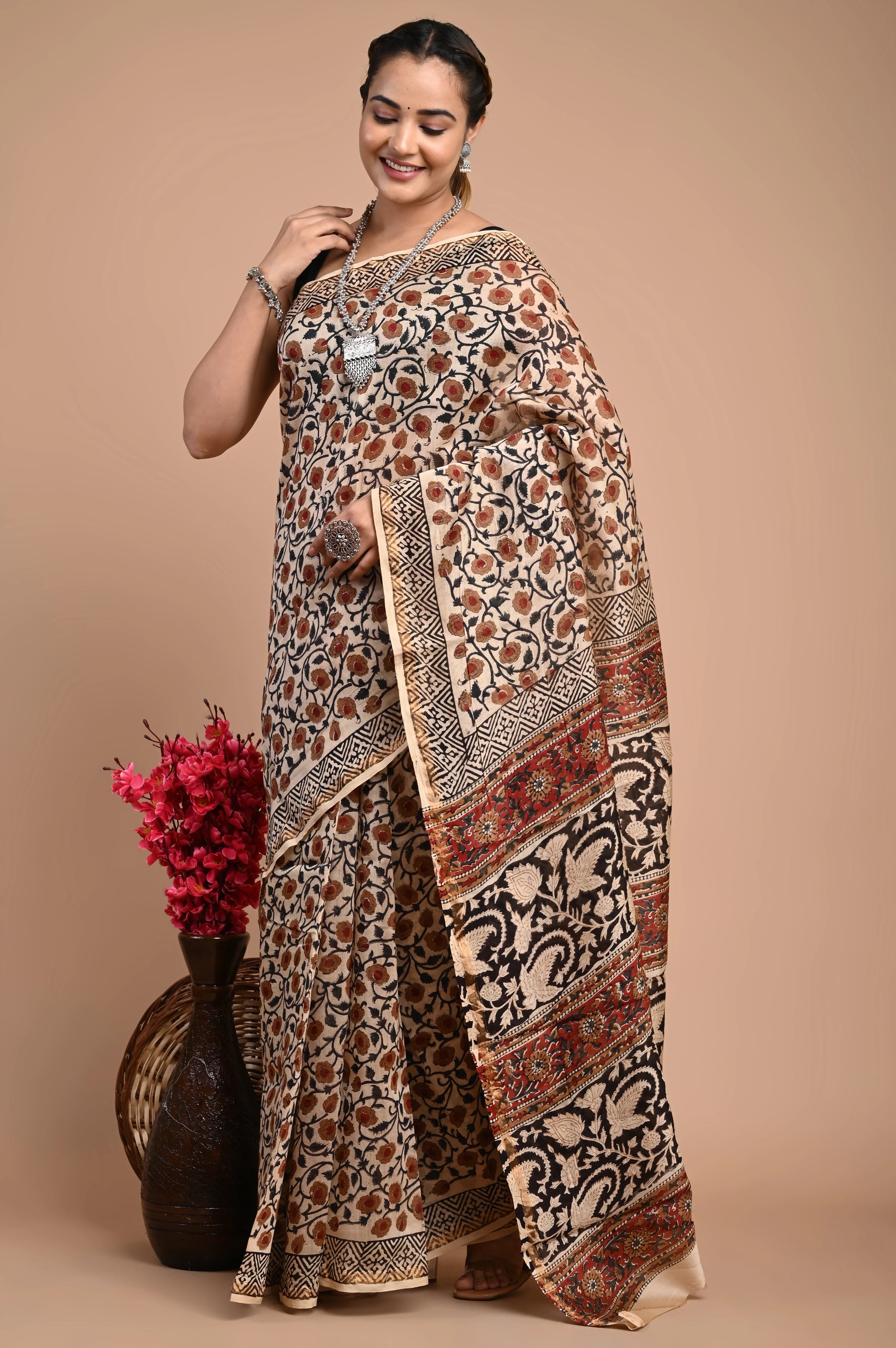 Hand Block Printed Chanderi Silk Saree (Bagru Print)