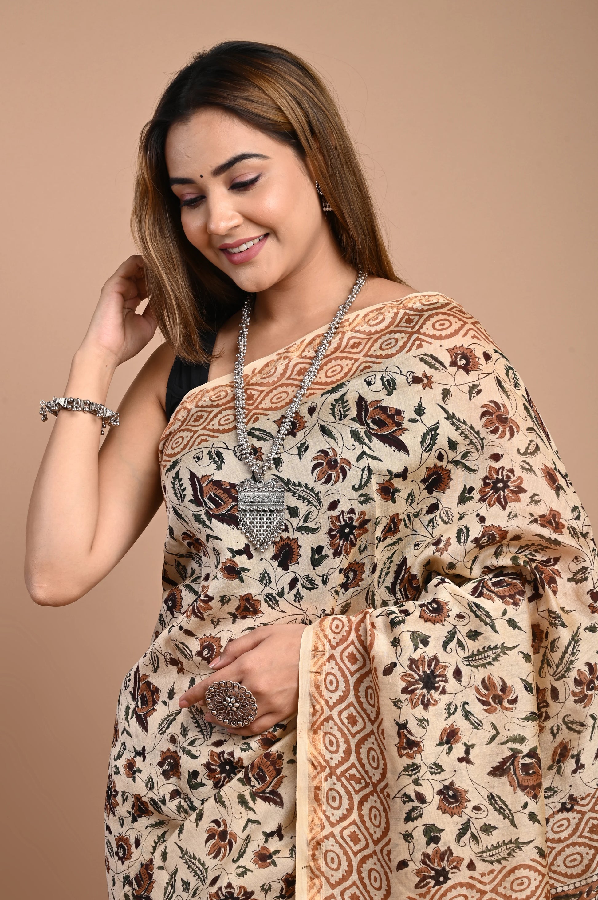 Hand Block Printed Chanderi Silk Saree (Bagru Print)