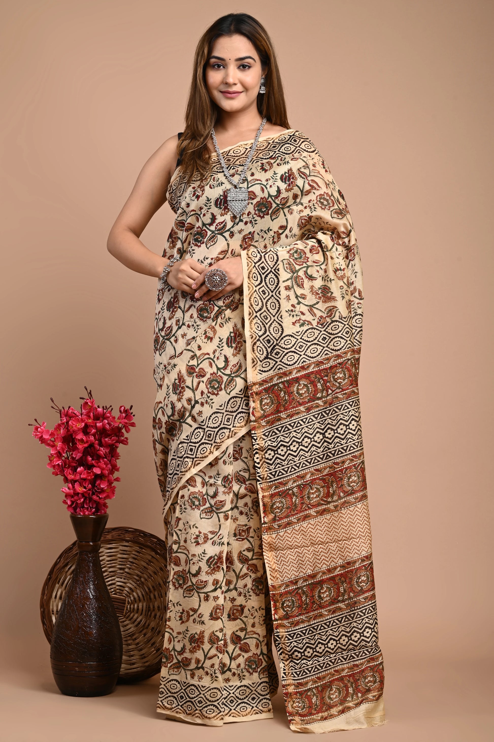 Hand Block Printed Chanderi Silk Saree (Bagru Print)