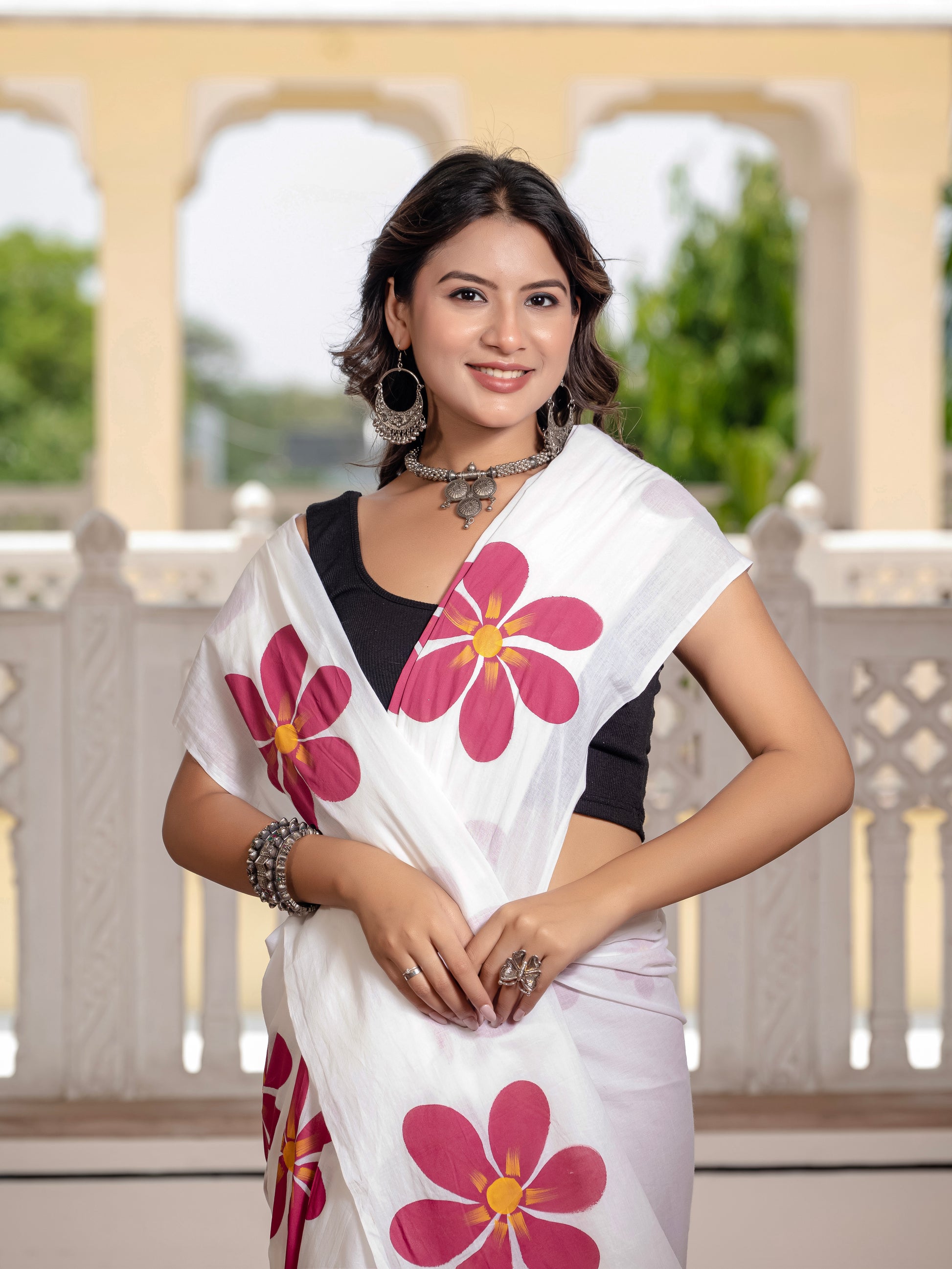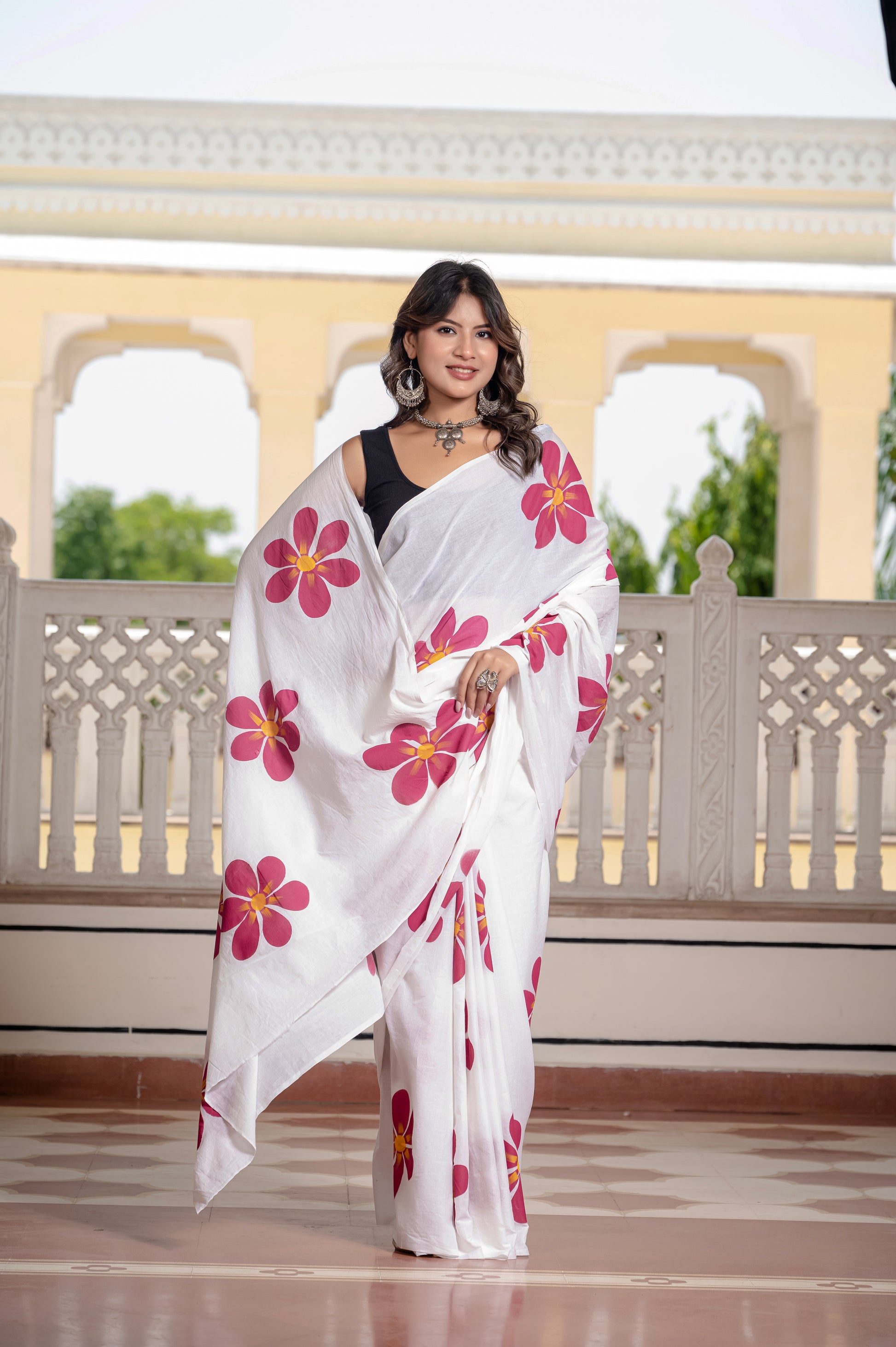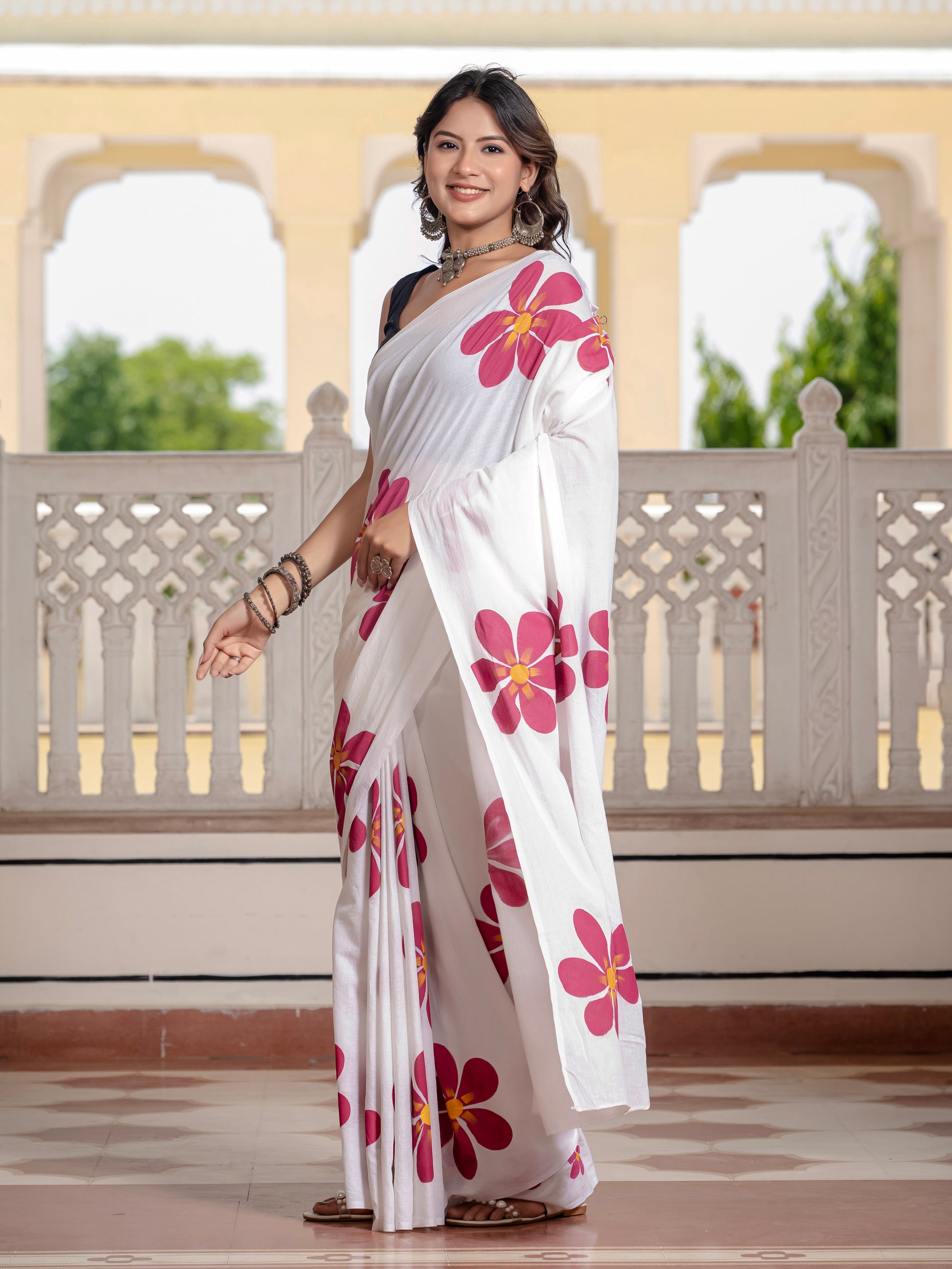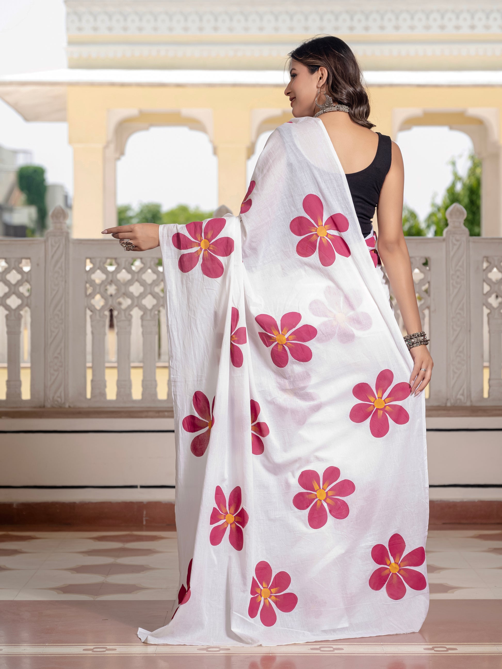 White Hand Printed Pure Mul Cotton Saree